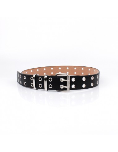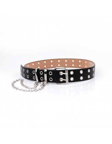 Cinturón de PU con hebilla níquel, múltiples ojales y aplique desmontable de cadena.