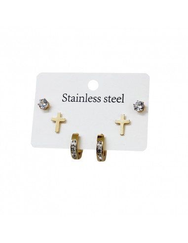 Set de tres pares de aros de acero dorado con strass.