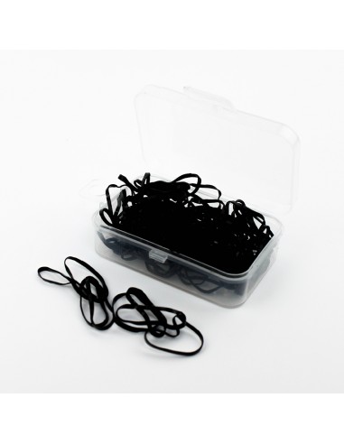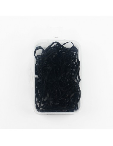 Box x 100 u aproximadamente de gomitas elásticas para pelo de colores. Box reutilizable.