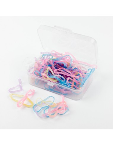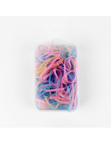 Box x 100 u aproximadamente de gomitas elásticas para pelo de colores. Box reutilizable.