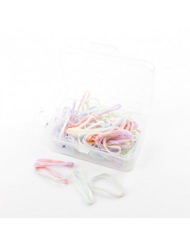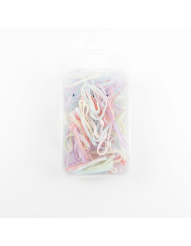 Box x 100 u aproximadamente de gomitas elásticas para pelo de colores. Box reutilizable.