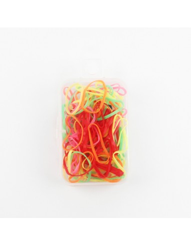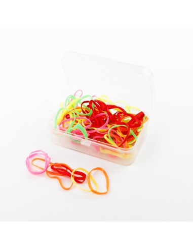 Box x 100 u aproximadamente de gomitas elásticas para pelo de colores. Box reutilizable.