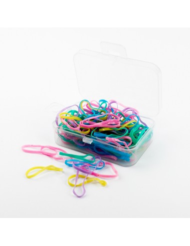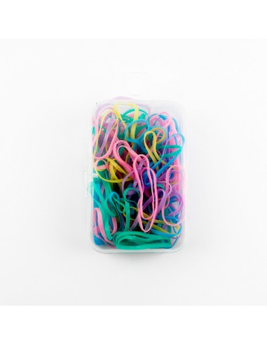 Box x 100 u aproximadamente de gomitas elásticas para pelo de colores. Box reutilizable.