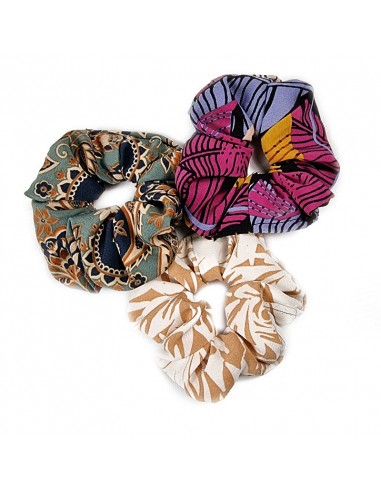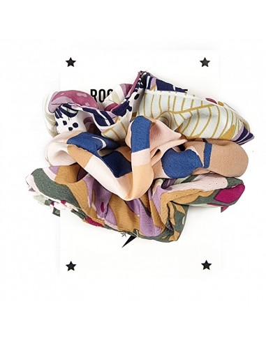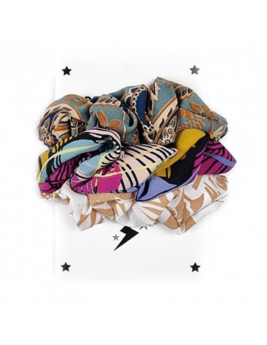 Pack de 3 scrunchies surtidos presentados en cartón exhibidor.