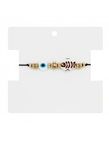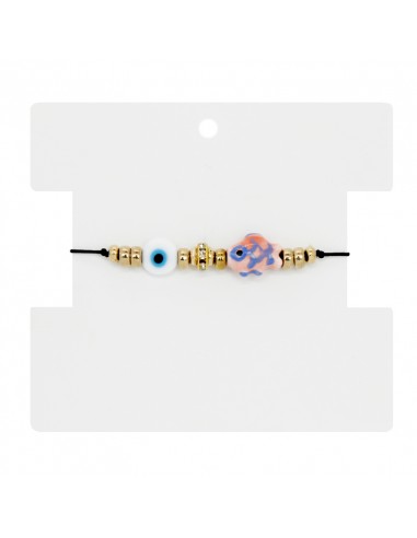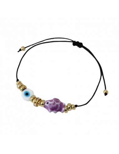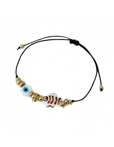 Pulsera de hilo con cierre macramé, ojo de vidrio y piezas exclusivas de cerámica.