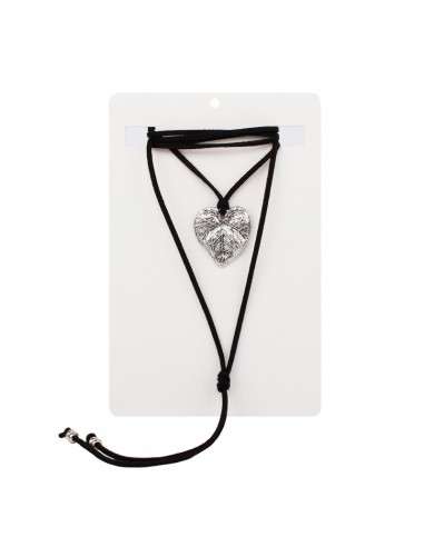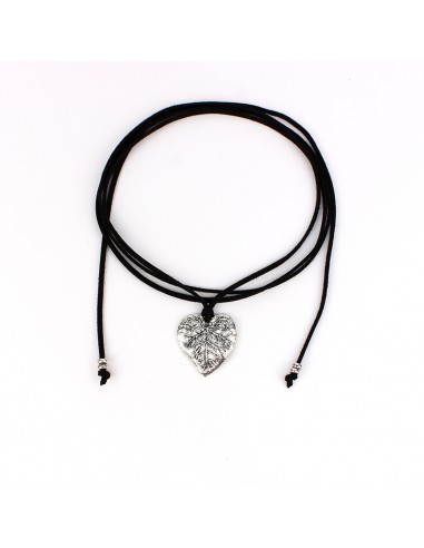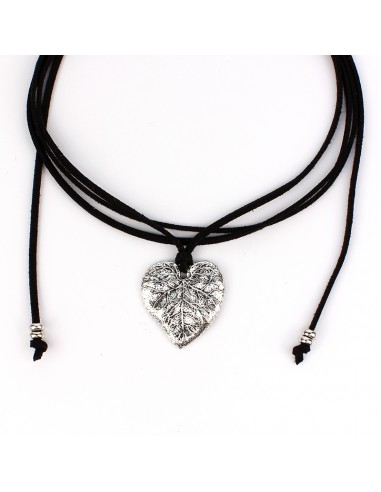 Collar corbatero de gamuza múltiples vueltas con dije exclusivo con forma de hoja níquel y terminaciones en punteras.