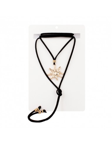 Collar corbatero de gamuza múltiples vueltas con dije exclusivo con forma de sol dorado y terminaciones en punteras.