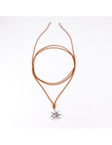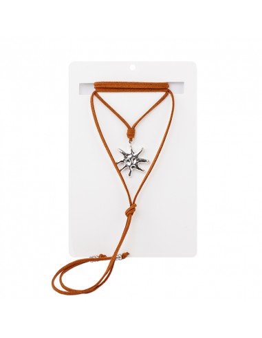 Collar corbatero de gamuza múltiples vueltas con dije exclusivo con forma de sol níquel y terminaciones en punteras.