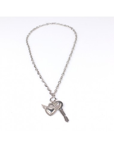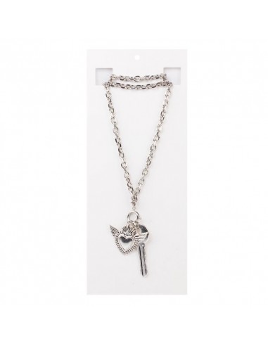 Collar corbatero de cadena diferenciada con dijes exclusivos en forma de corazón y llave níquel.