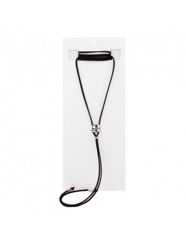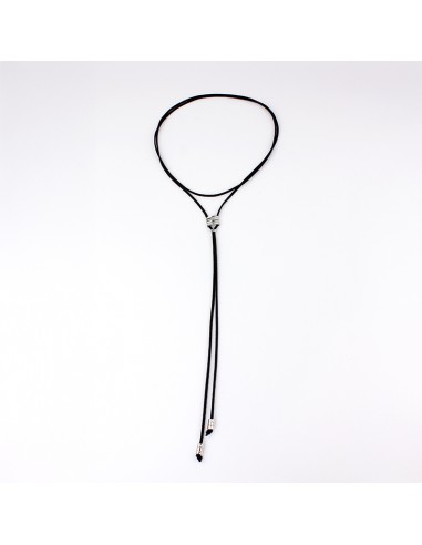 Collar corbatero de gamuza múltiples vueltas con dije exclusivo geométrico níquel y terminaciones en punteras. Medidas: 140 cm