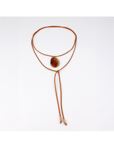 Collar de múltiples vueltas de gamuza con dije exclusivo de acrílico y terminaciones en punteras.