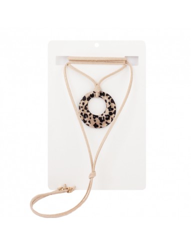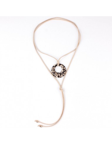 Collar de múltiples vueltas de gamuza con dije exclusivo forrado en tela animal print y terminales en punteras.