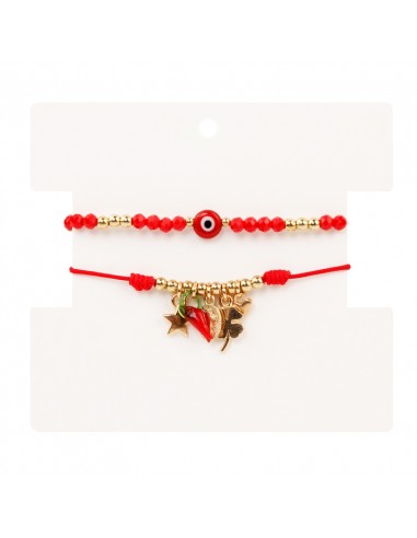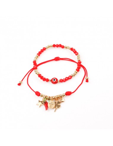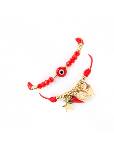 Set de pulsera de hilo con múltiples charms exclusivos esotéricos dorados, acompañada de pulsera de roca de cristal con pieza de vidrio exclusiva con forma de ojo y cierre macramé.