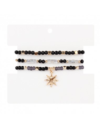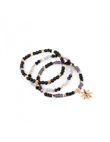 Set de tres pulseras elásticas de rocas de cristal, mostacillas y bolitas de vidrio con piezas de exclusivas de distintas formas y tamaños doradas.
