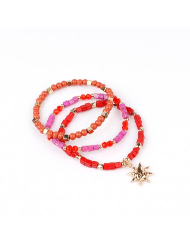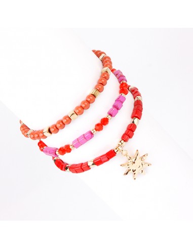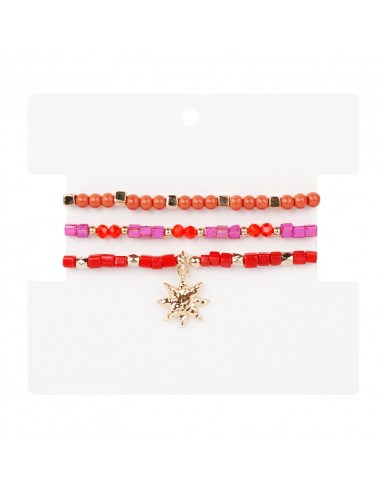 Set de tres pulseras elásticas de rocas de cristal, mostacillas y bolitas de vidrio con piezas de exclusivas de distintas formas y tamaños doradas.