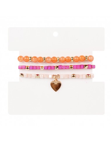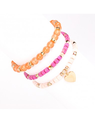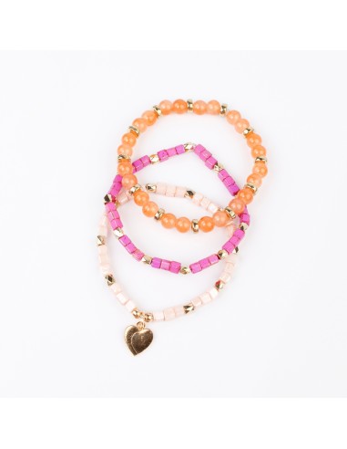 Set de tres pulseras elásticas de mostacillas y bolitas de vidrio con piezas de exclusivas de distintas formas y tamaños doradas.