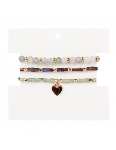 Set de tres pulseras elásticas de mostacillas y bolitas de vidrio con piezas de exclusivas de distintas formas y tamaños doradas.