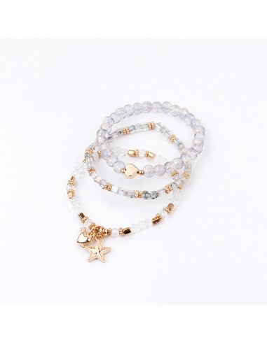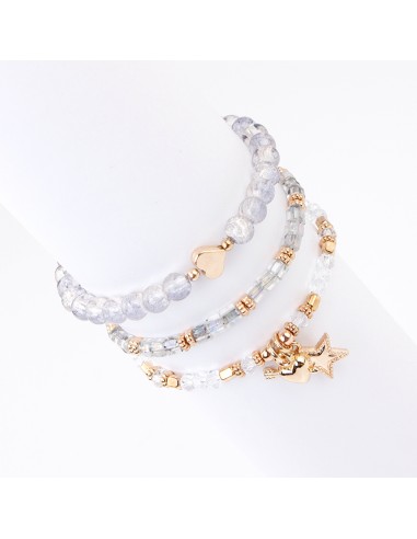 Set de tres pulsera elásticas de piezas de vidrio roca de cristal y mostacillas con dijes exclusivos dorados.