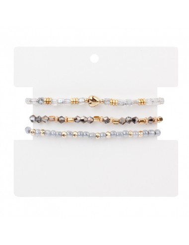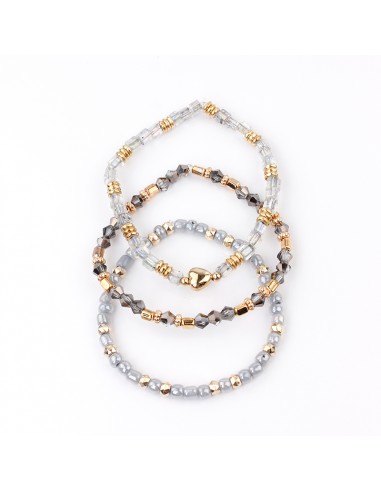 Set de tres pulseras elásticas de roca de cristal bicono y mostacillas con dije exclusivo dorado.