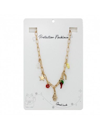 Collar de cadena diferenciada con piezas de vidrio y dijes exclusivos dorados.