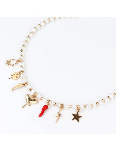 Collar de símil perlas de río con múltiples dijes exclusivos dorados.