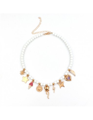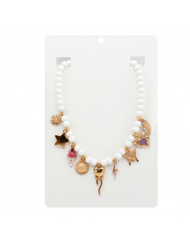 Collar de bolitas de vidrio con múltiples dijes exclusivos de strass y pintados a mano dorados.