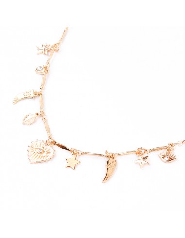 Collar corto de cadena diferenciada con múltiples charms con strass de distintas formas dorados.