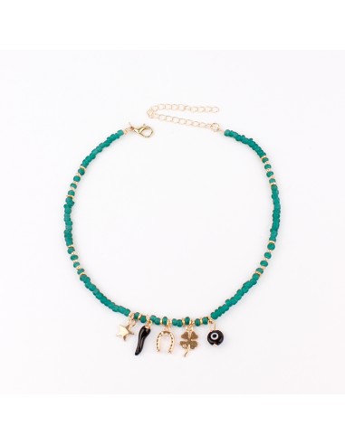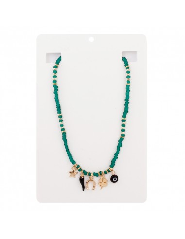 Collar corto de mostacillas diferenciadas y múltiples charms exclusivos dorados.