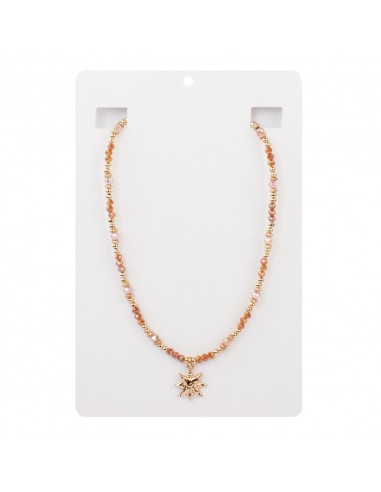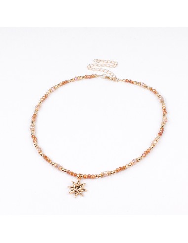 Collar corto de rocas de mostacillas, roca de cristal y piezas diferenciadas pasantes doradas con dije exclusivo con forma de sol.