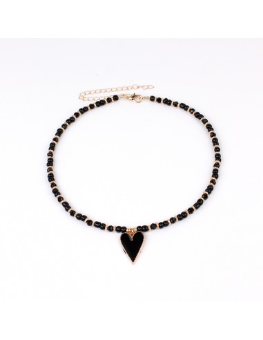 Collar corto de rocas de mostacillas, roca de cristal y piezas diferenciadas pasantes doradas con dije exclusivo con forma de corazón pintado a mano.