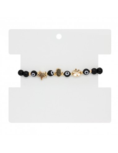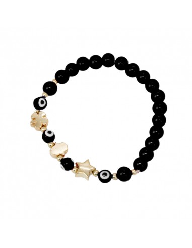 Pulsera elástica de bolitas y ojos de vidrio con dijes exclusivos dorados.
