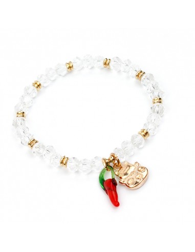 Pulsera elástica de rocas de cristal con dije exclusivo dorado y ají de vidrio.