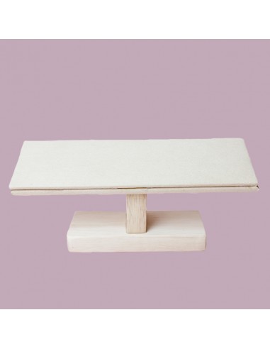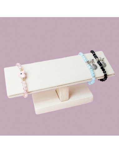 Exhibidor de pulseras con base de madera y brazo de tela.